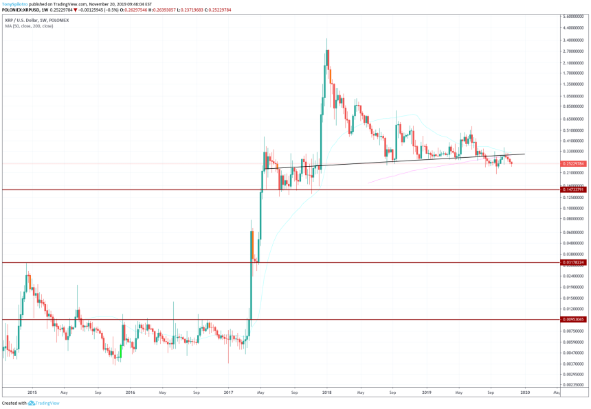 Below current price levels, horizontal support lies at roughly 14 cents per XRP – a support level dating back to the 2017 crypto bull market. If support there cannot hold, a far deeper drop would be possible, one that would take the price per XRP to as low as 3 cents per XRP.