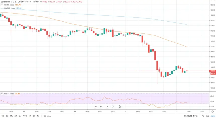 According to Tradingview.com ETH prices fell from $175 to wick out at $155 before recovering to around $160 where it currently trades. The 9% dump has put prices back at long term support which held in October, September and back in early May.