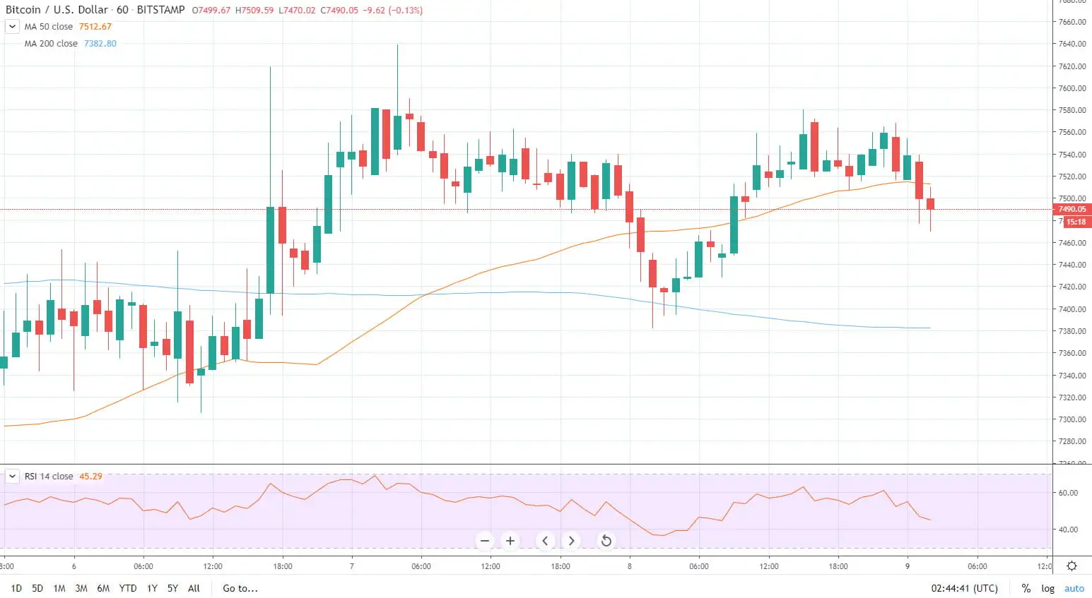 Crypto markets were lifted on Friday which resulted in BTC topping out over $7,600 briefly on Saturday. A Sunday dip to $7,400 was quickly recovered and the best part of the past two days has been spent at $7,500.