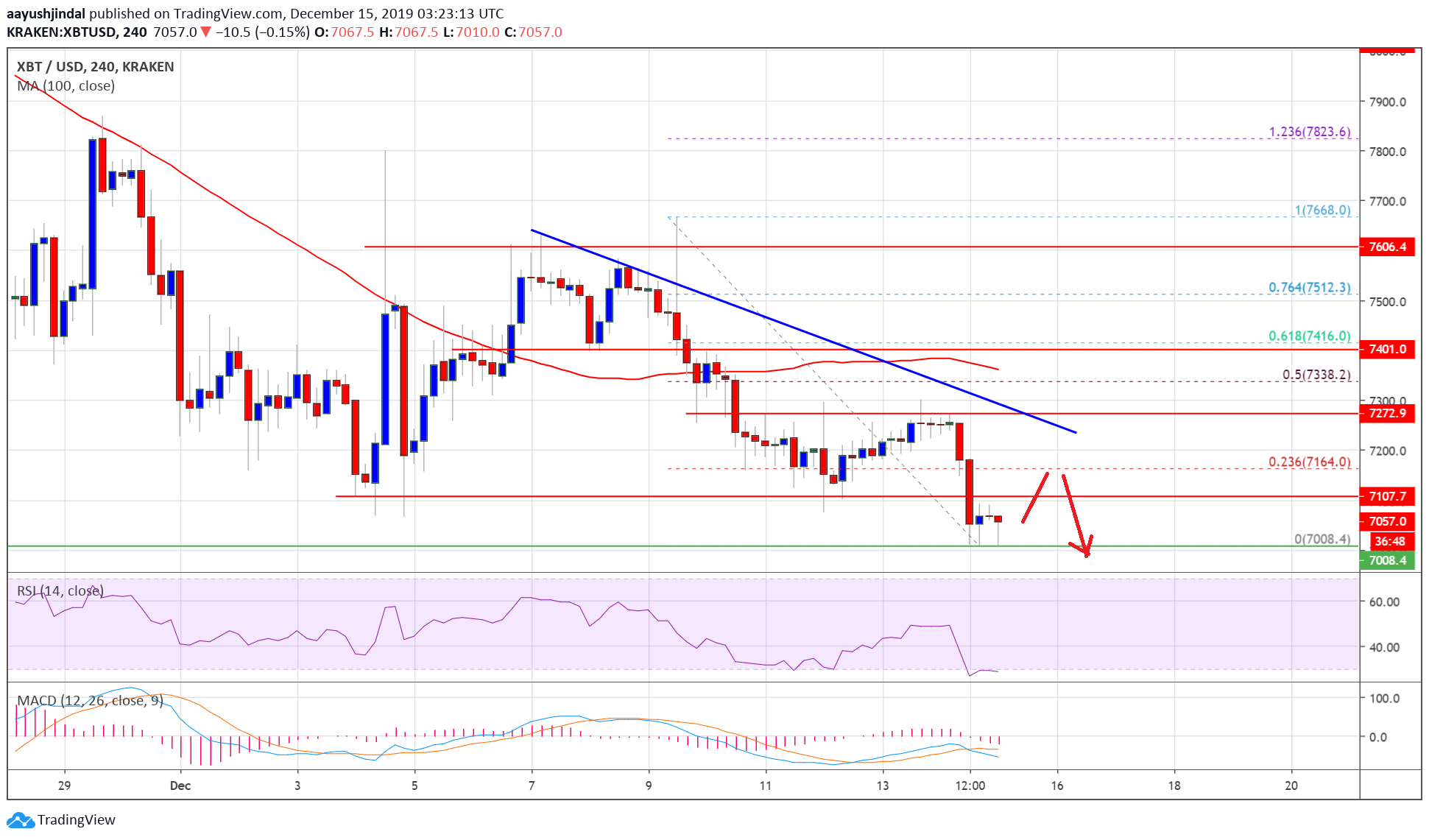 Bitcoin price is back in a downtrend below $7,200 against the US Dollar. BTC could continue to move down below $7,000 and $6,880 in the near term.
