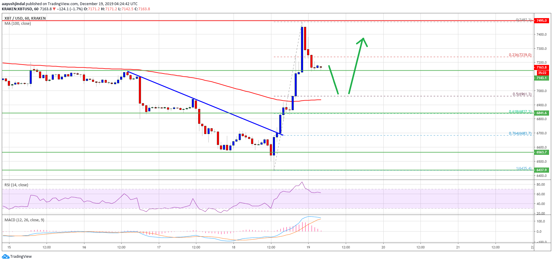 Finally, it spiked above the $7,200 and $7,300 resistance levels. Bitcoin traded close to the $7,500 level and a new intraday high was formed near $7,487. At the moment, the price is correcting gains below $7,300.