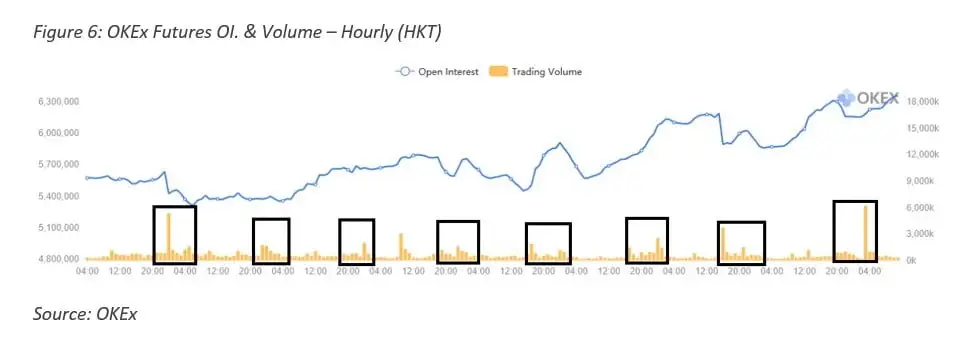 Similarly, our data revealed a comparable pattern. Recent figures from OKEx shows that futures contracts trading volume were generally higher during late HKT (afternoon time across Continental Europe.)