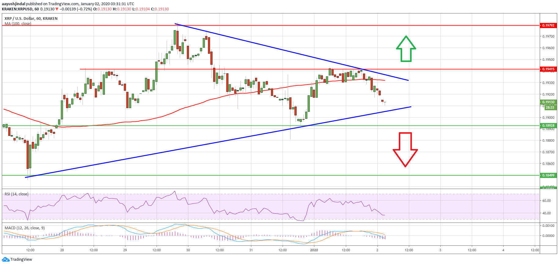 - There is a major breakout pattern forming with resistance near $0.1930 on the hourly chart of the XRP/USD pair (data source from Kraken).