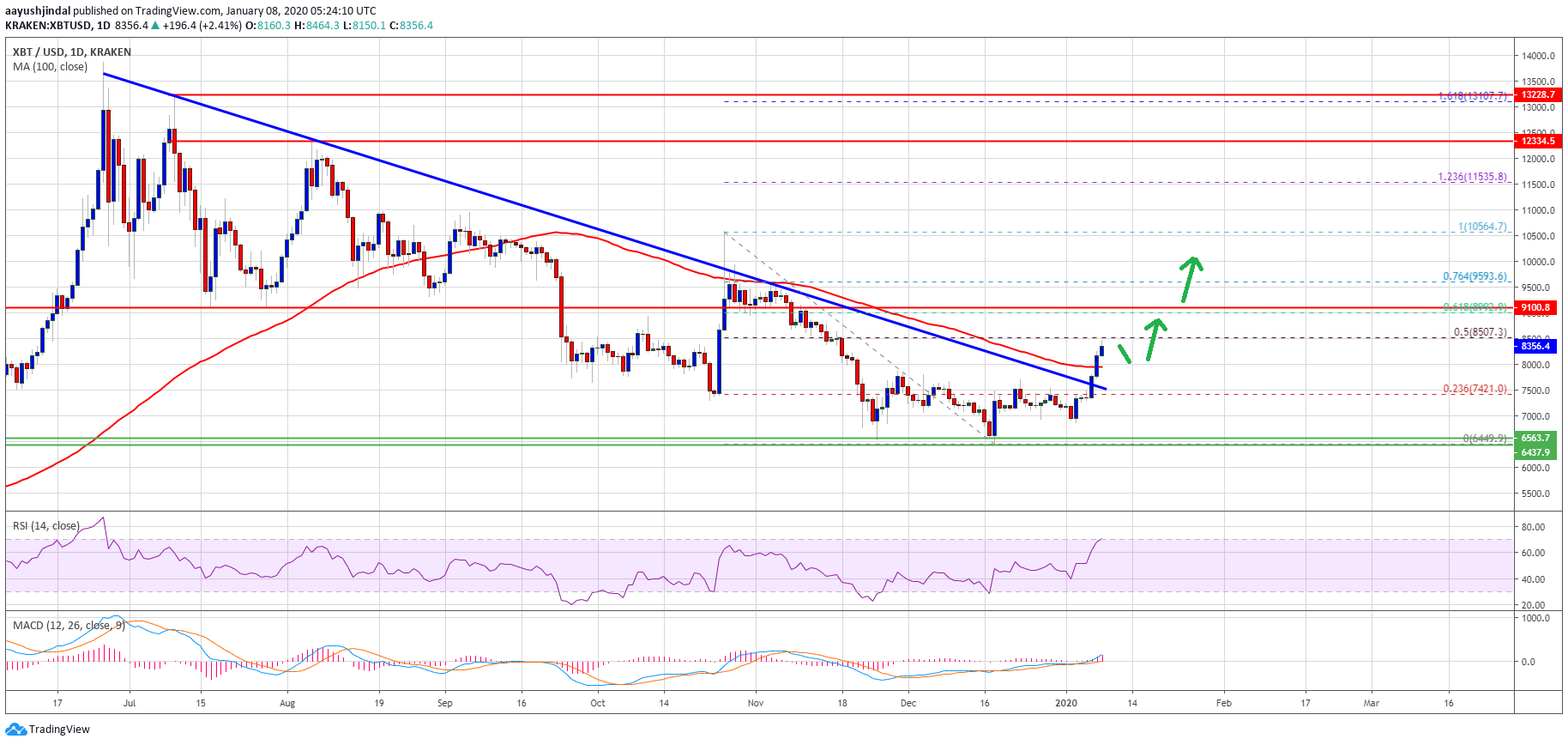 Looking at the chart, bitcoin price is showing a lot of positive signs above the $8,000 support and the 100-day SMA. As long as there is no daily close below the 100 SMA, there are chances of a strong rise towards the $10,000 resistance.