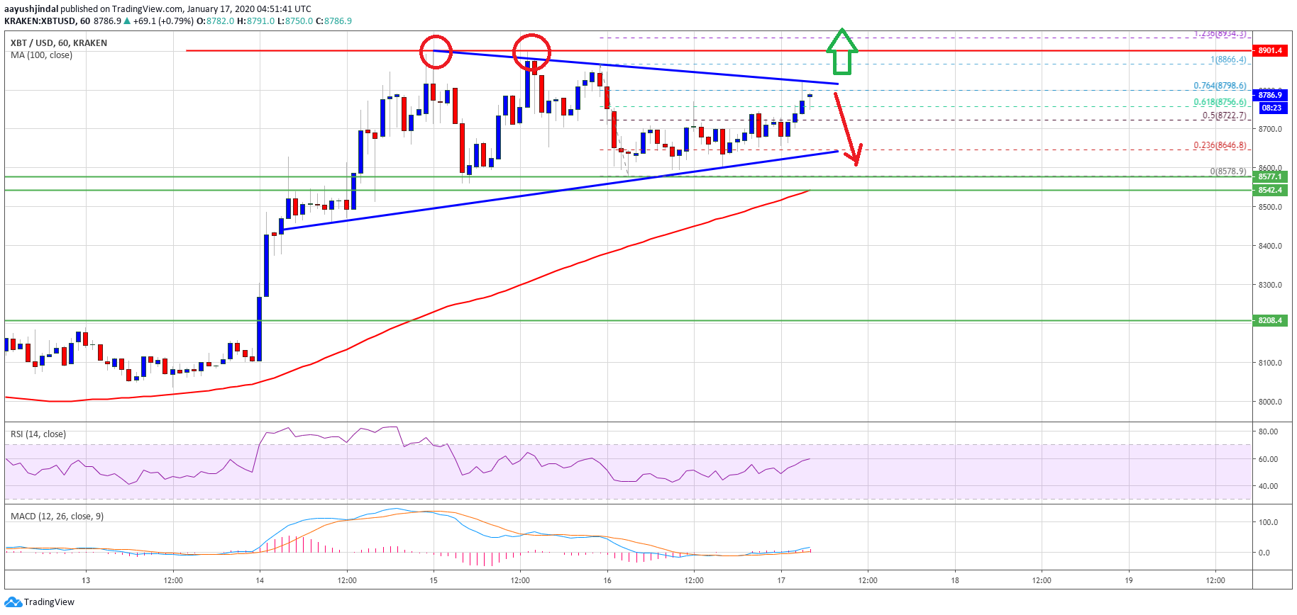 If BTC price fails to climb above the triangle resistance and $8,840, it is likely to move down. The first key support is near the triangle at $8,640.