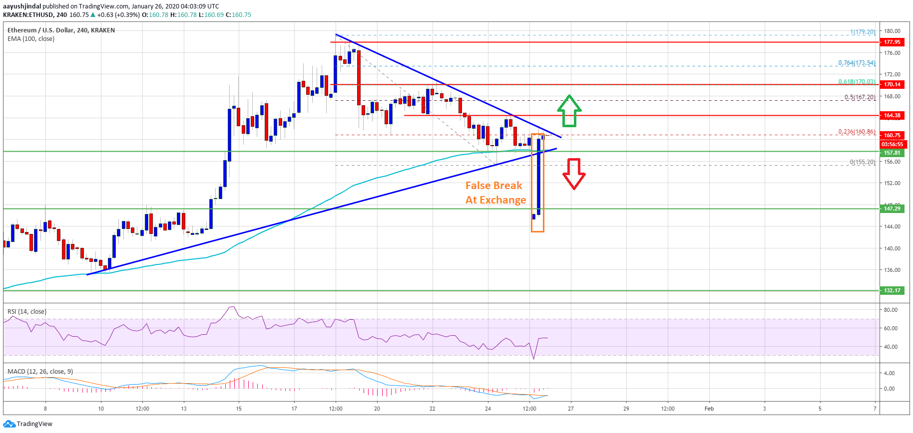 Therefore, a downside break below the key $158 support area and the 100 simple moving average (4-hours) could start a downside extension. In the mentioned case, Ethereum price is likely to dip towards the $150 level.