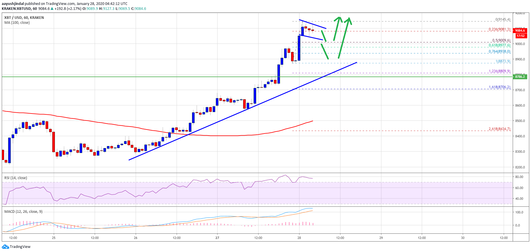 Bitcoin gained bullish momentum above the key $8,800 resistance. As a result, BTC price surpassed $9,000 and it seems like the bulls are now aiming a test of $9,500.