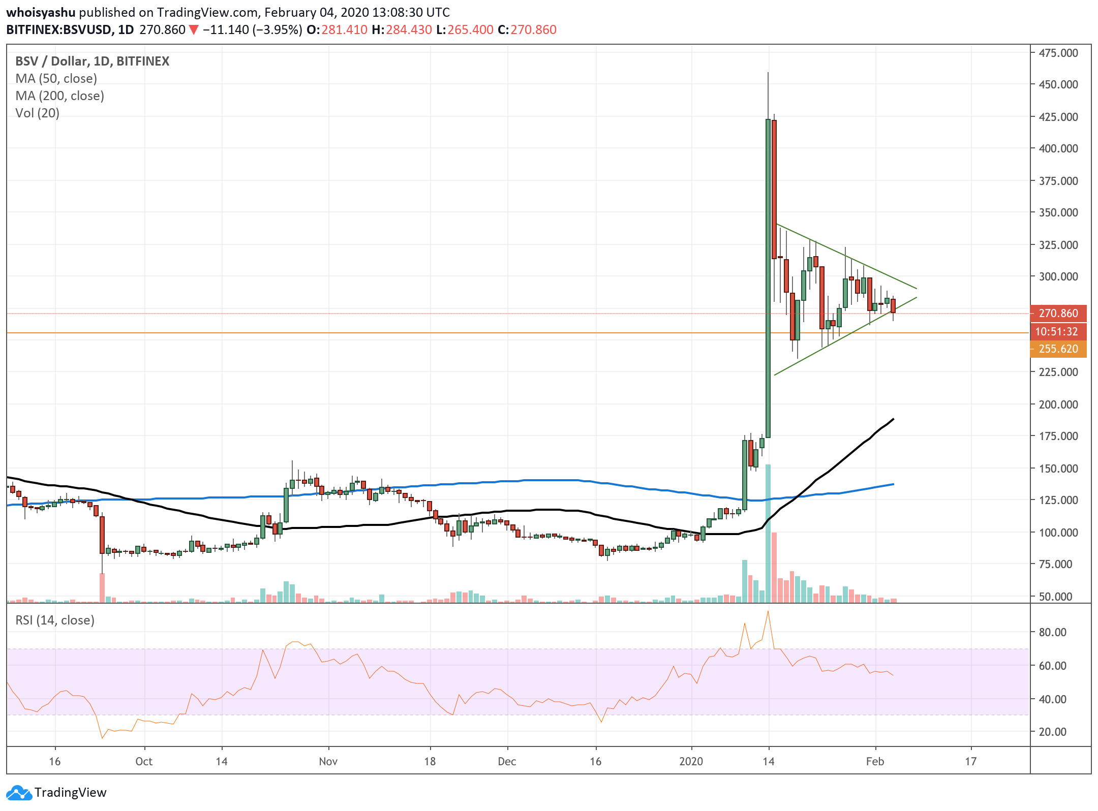 At $270.86, the BSV/USD pair is now down by more than 41 percent from its 2020 top. The pair’s daily Relative Strength Indicator, coupled with lackluster volumes, shows upside exhaustion. That means BSV could continue its plunge in February 2020 – favorable fundamentals aside.