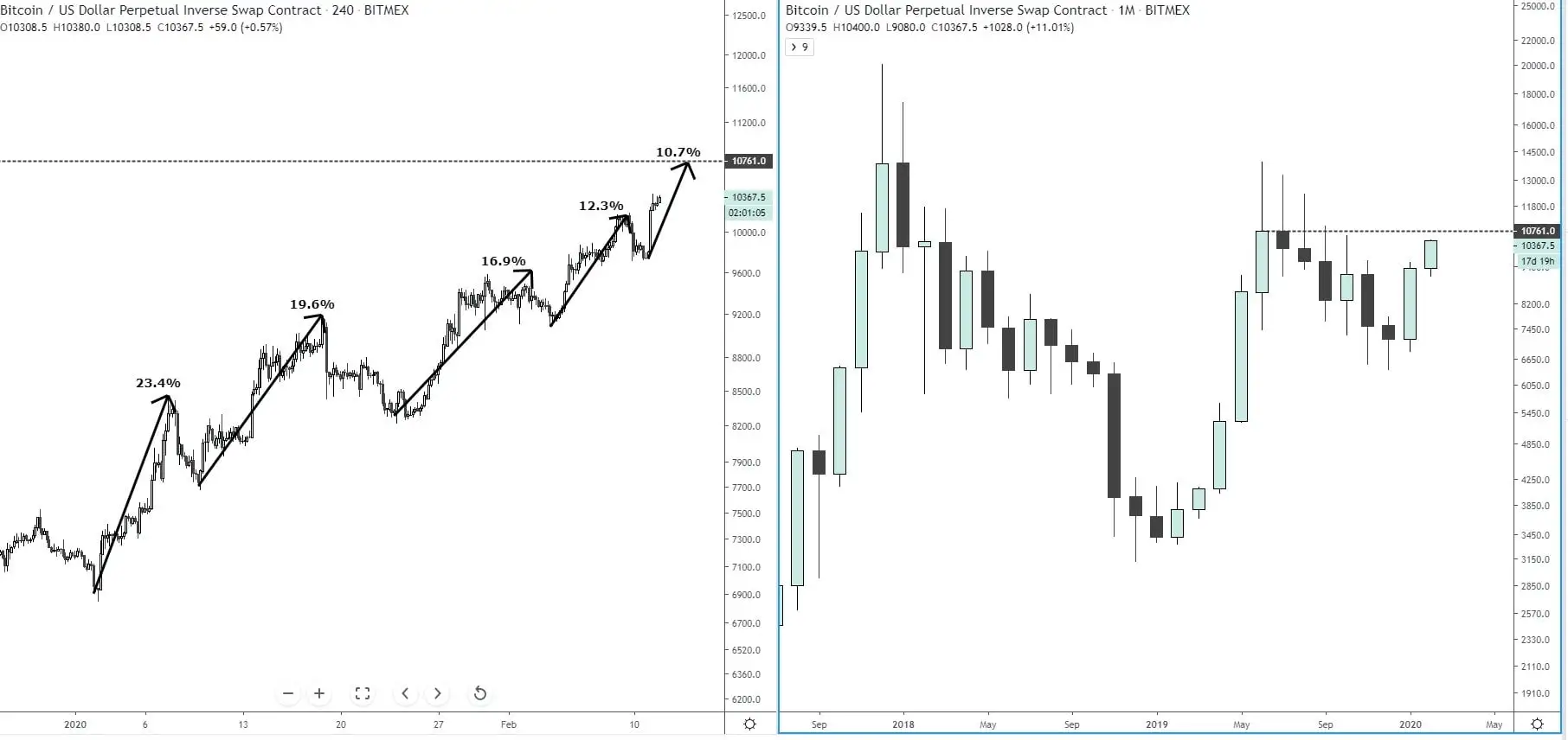 “After each pullback on this uptrend, the gains continue to decrease [with] each move,” tweeted Mr. Rager. “23%, 19%, 16%, 12% and a move up to the monthly resistance would be a 10% gain before a possible pullback. I’m watching monthly open at $10,761 as a major resistance much like it was at $13ks.”