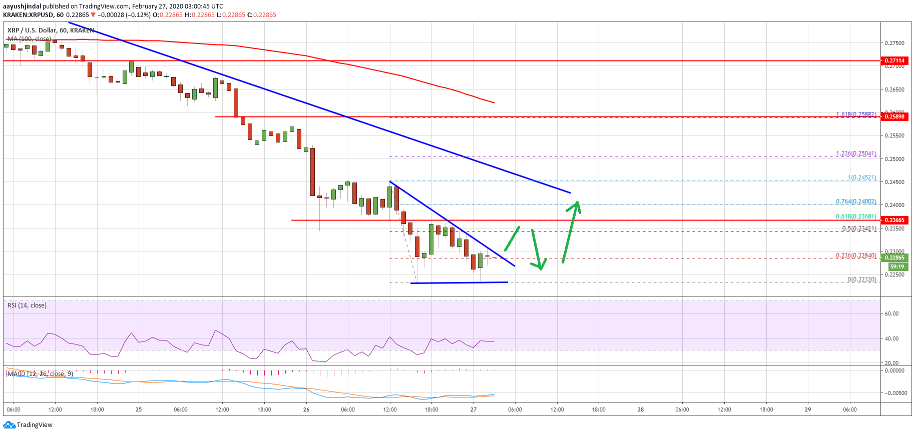 If ripple fails to correct above the $0.2300 and $0.2365 resistance levels, it could continue to move down. The first key support on the downside is near the $0.2240 level.
