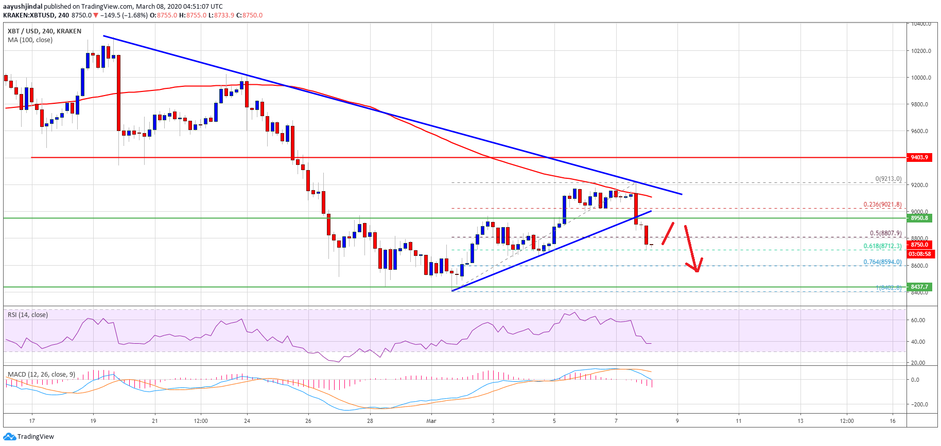If there is a clear break above the trend line and the $9,200 resistance, the price might start a strong rally towards the $9,500 and $9,800 levels in the near term. Overall, the trend is now negative and the price might slide further towards $8,400.