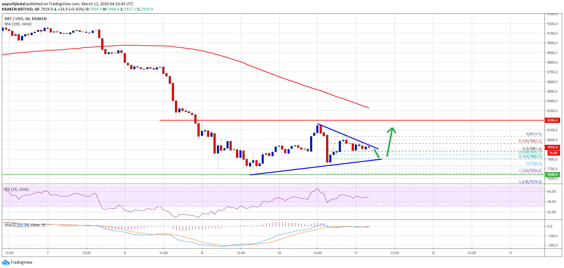 More importantly, there is a key contracting triangle forming with resistance near $7,950 on the hourly chart of the BTC/USD pair. If there is an upside break above the $7,950 and $8,000 levels, the price could make another attempt to surpass the main $8,200 resistance area in the near term.