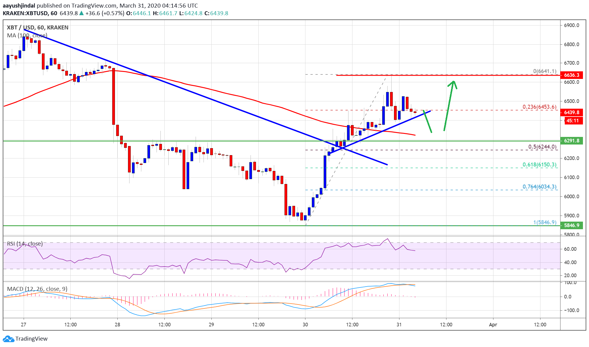 The price gained pace and traded above the $6,400 pivot area. It is up more than 8% and it even climbed above the $6,500 resistance. A high is formed near the $6,641 level and it seems like the price is struggling to gain strength above $6,600.