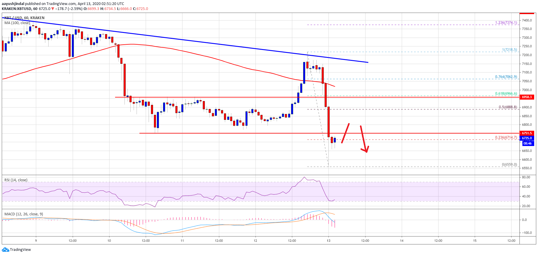 The pair formed a high near the $7,218 and declined heavily. It trimmed all its gains and even broke the $6,700 support area. A new weekly low is formed near the $6,559 level and the price is currently correcting higher.