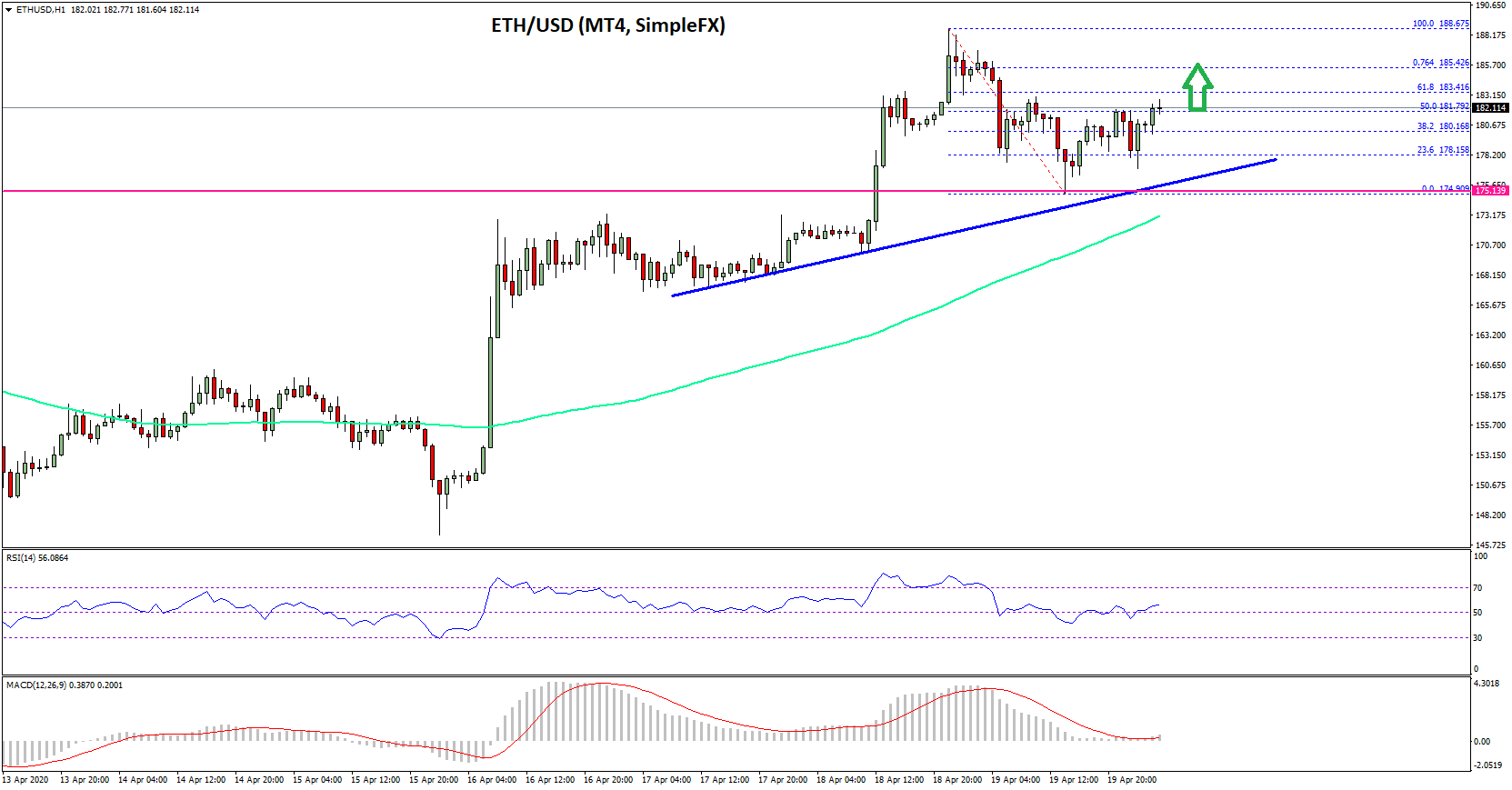 The recent low was formed near $175 and Ethereum is currently rising. There was a break above the $180 level, plus the 50% Fib retracement level of the recent correction wave from the $188 high to $175 swing low.