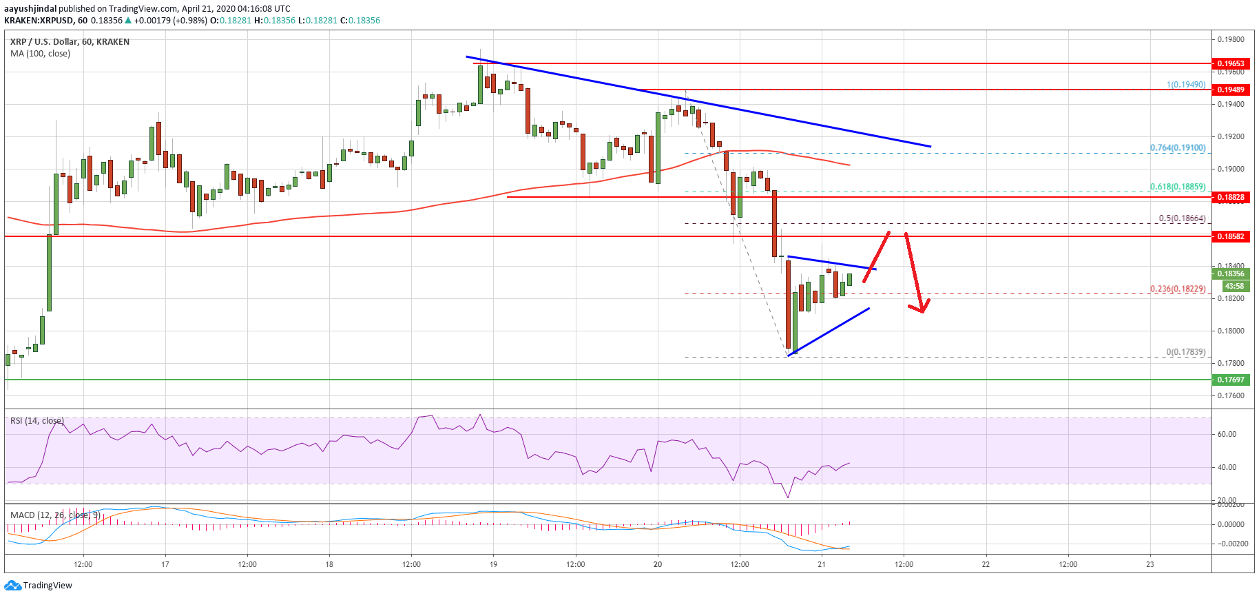 Besides, there was a close below the $0.1850 support and the 100 hourly simple moving average. It opened the doors for more downsides below $0.1820. The price traded to a new weekly low at $0.1783 and it is currently correcting higher.