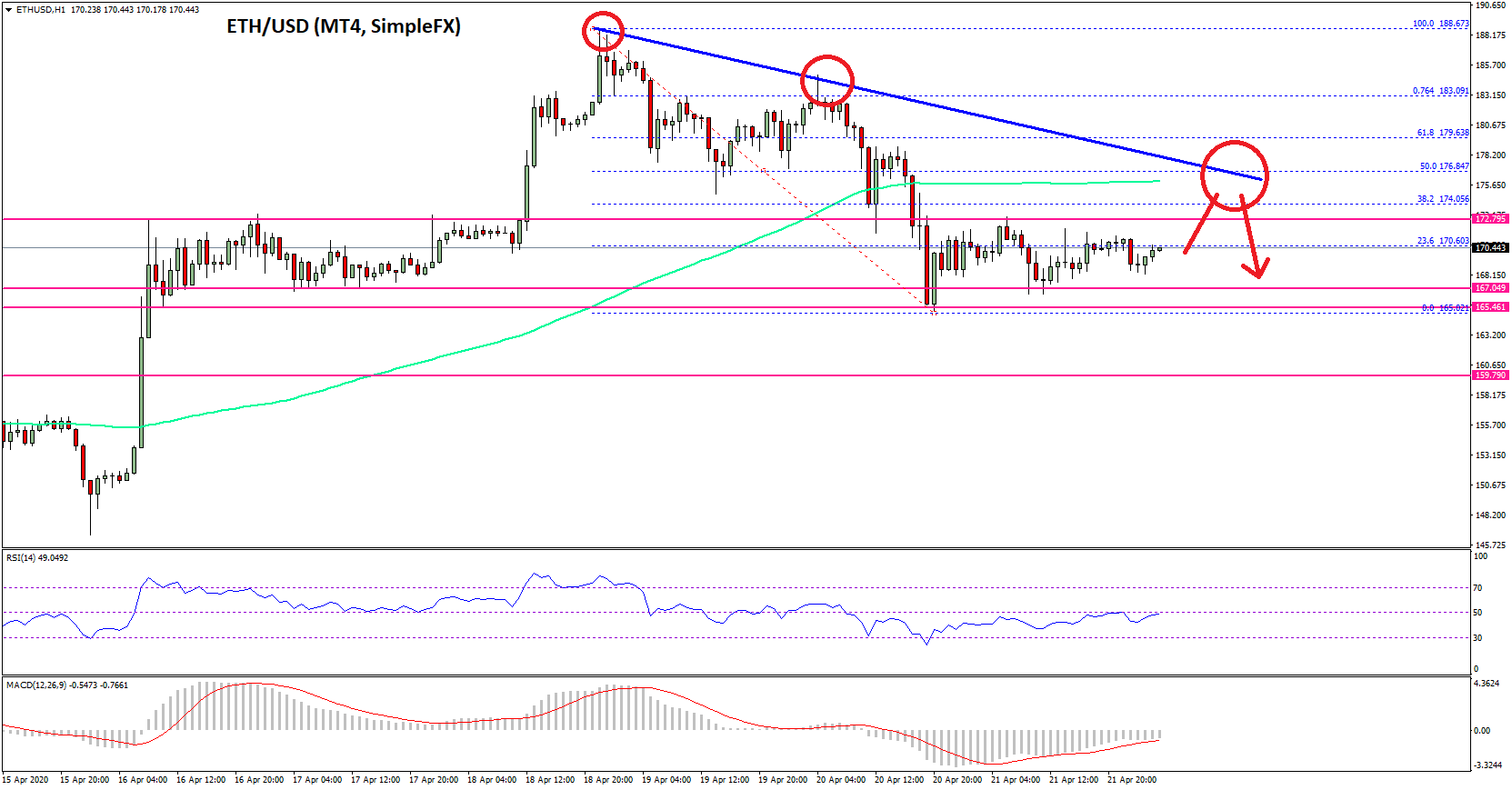 - There is a key bearish trend line forming with resistance near $176 on the hourly chart of ETH/USD (data feed via SimpleFX).