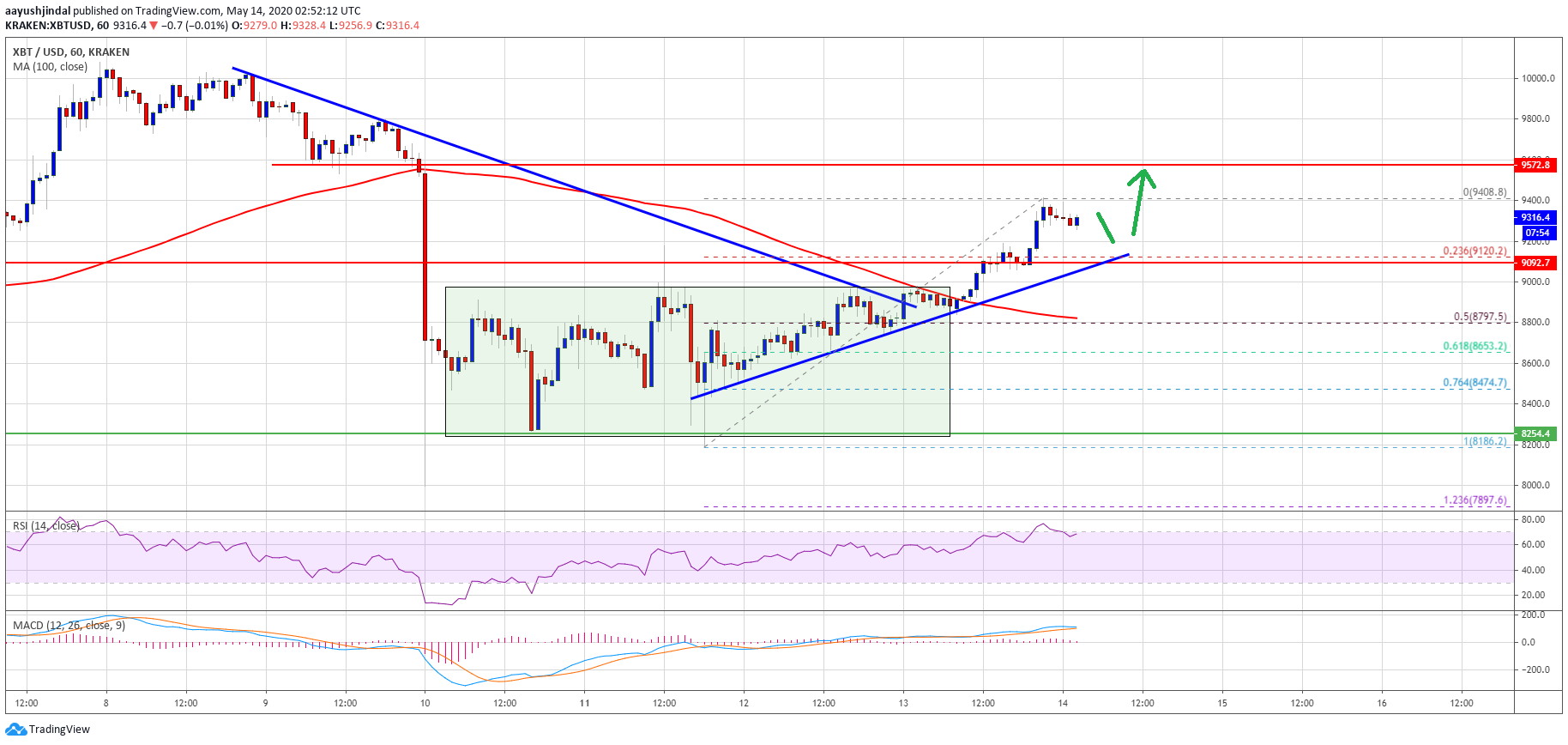 Bitcoin traded as high as $9,408 and it is currently consolidating gains. An initial support on the downside is near the $9,120 level. It is close to the 23.6% Fib retracement level of the recent rise from the $8,186 low to $9,408 high.