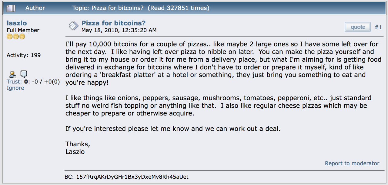 Hanyecz posted an ad on bitcoin-specific chart forum, BitcoinTalk.org, whose title read “Bitcoin For Pizza.” He offered to purchase two pizzas for 10,000 BTC. For the first two days, nobody responded. On the third, Hanyecz has a merchant interested in trading his services for the cryptocurrency.