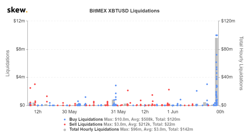 As a result, data from Skew.com shows that more than $80 million worth of short positions were liquidated on BitMEX alone. These shorts were liquidated within the span of an hour, and these numbers only count BitMEX, not other margin exchanges.