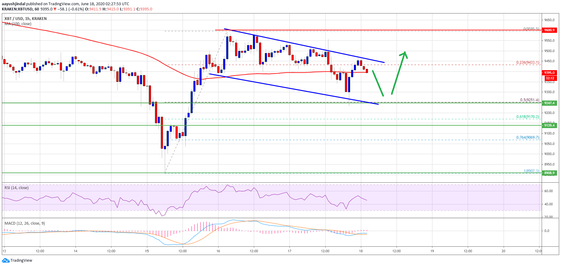 - There is a bullish flag pattern is likely forming with current resistance near $9,450 on the hourly chart of the BTC/USD pair (data feed from Kraken).