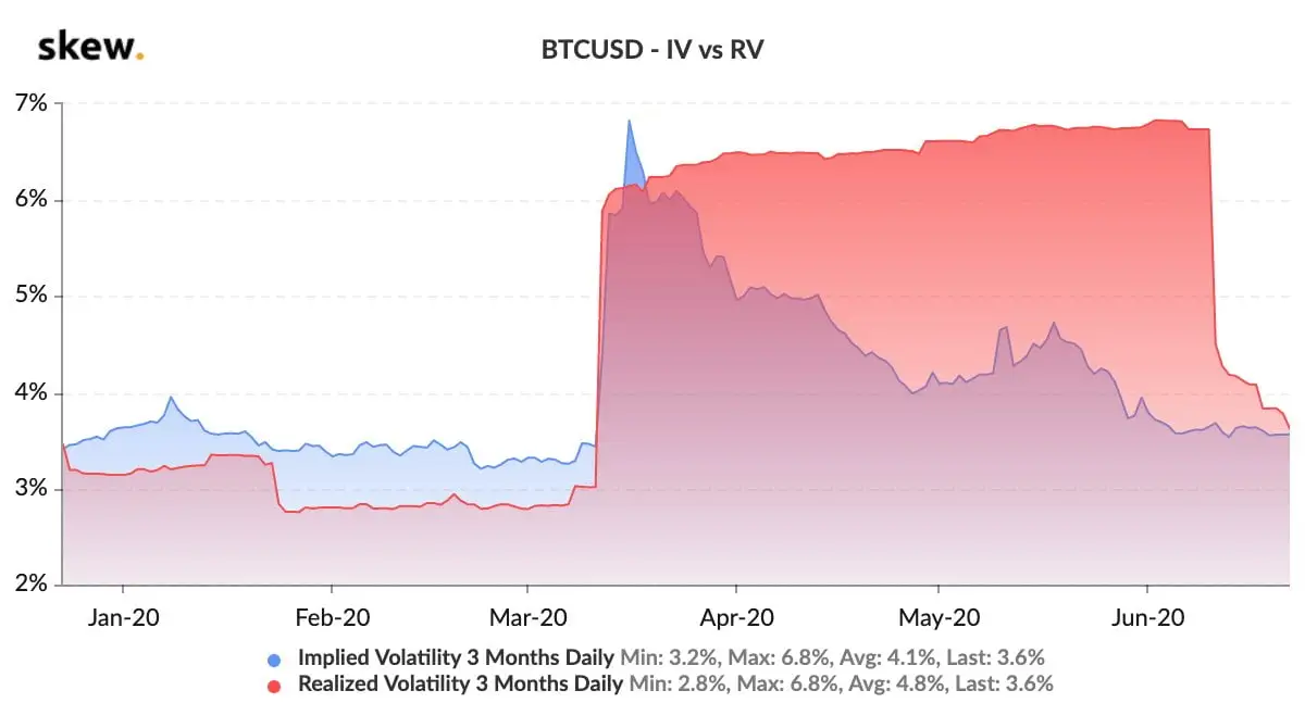 “BTC 3mth Realized Volatility about to drop below the 3mths Implied Volatility for the first time in several months as the week of Black Thursday disappears from the rearview mirror.”