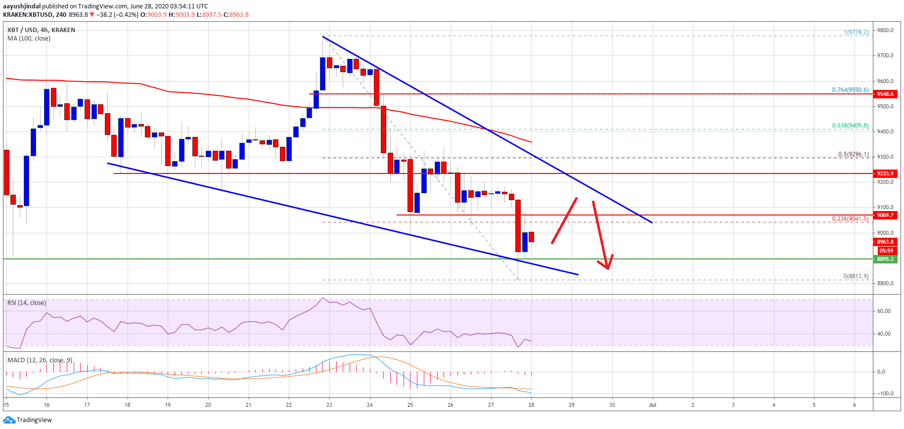 It opened the doors for more losses and the price even broke the $9,000 support. A new monthly low is formed near $8,813 and the price is currently correcting higher. An initial resistance is near the $9,000 and $9,040 levels.