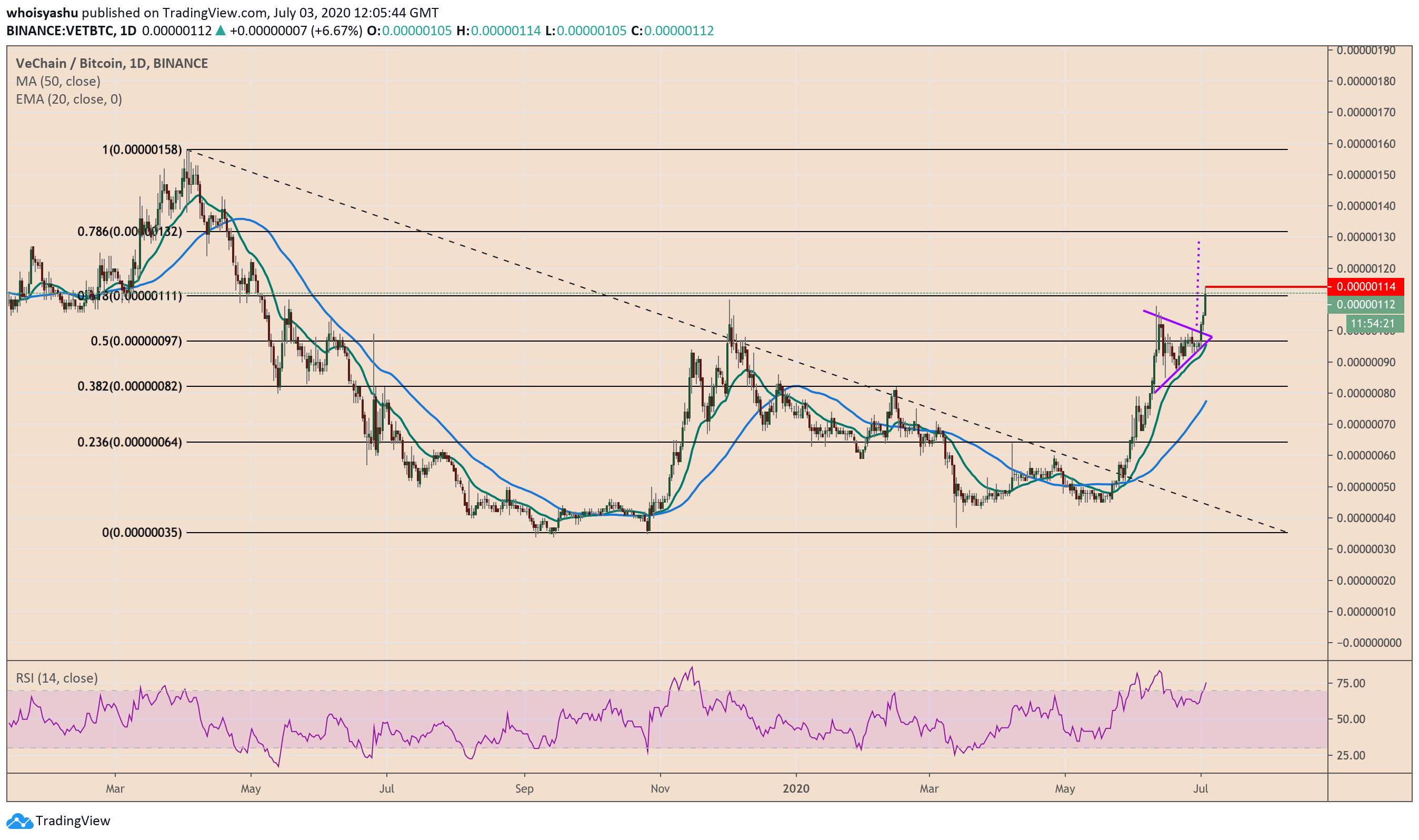 The crypto token’s bullish bias is also gaining strength from a string of concrete support levels. At first, VET/BTC is trading above its 20-EMA (the green wave) and 50-SMA (the blue wave). Moreover, it is holding an incredible price floor at around 88 sats.