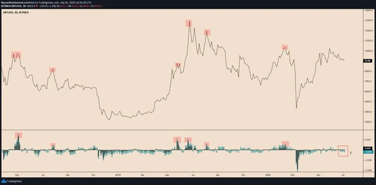 Chart of BTC's price over the past ~two years with funding rate indicator from trader Byzantine General (@ByzGeneral on Twitter). Chart from TradingView.com