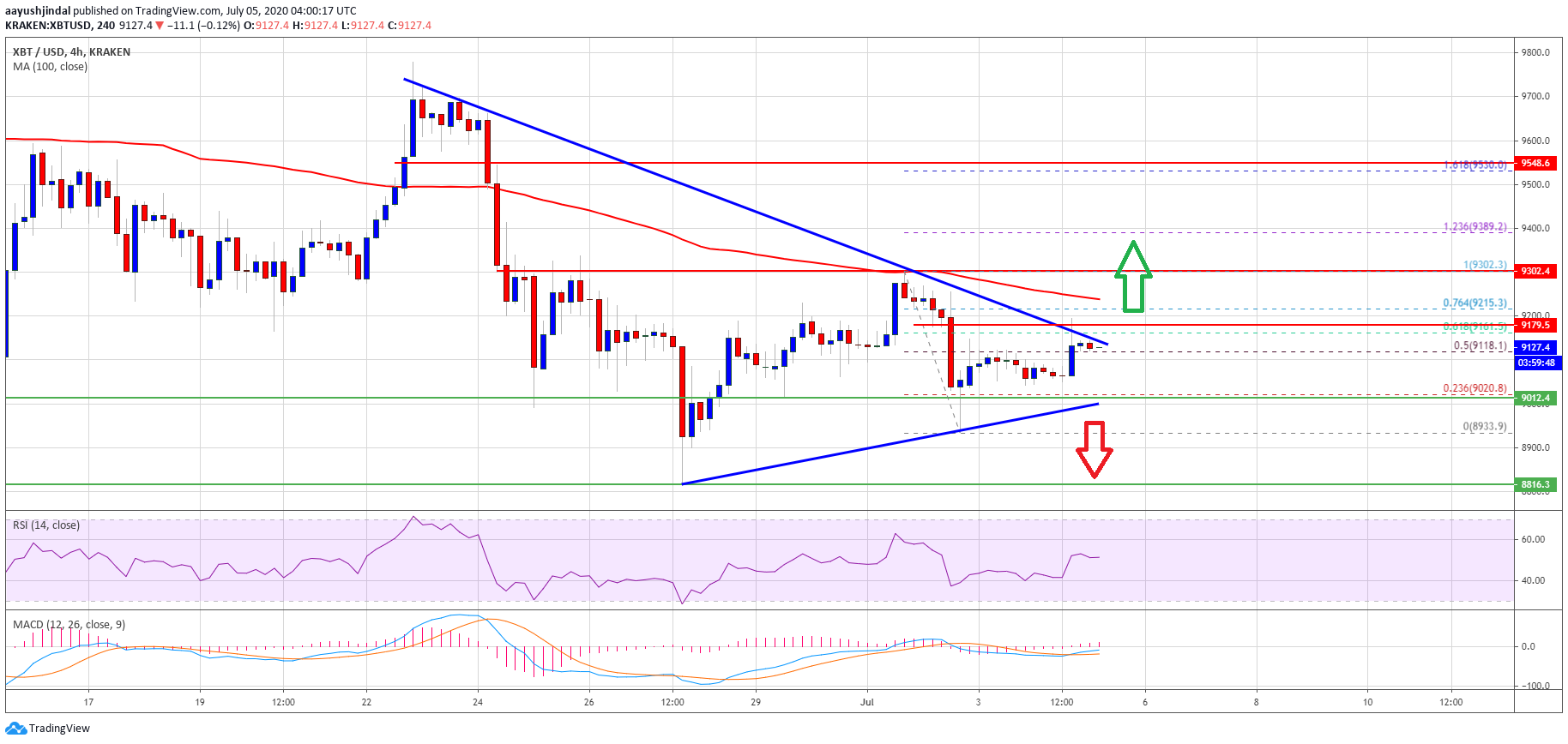 If bitcoin struggles to clear the $9,200 and $9,300 resistance levels, there is a risk of a sharp decline. The first major support is near the $9,000 level and connecting bullish trend line on the same chart.