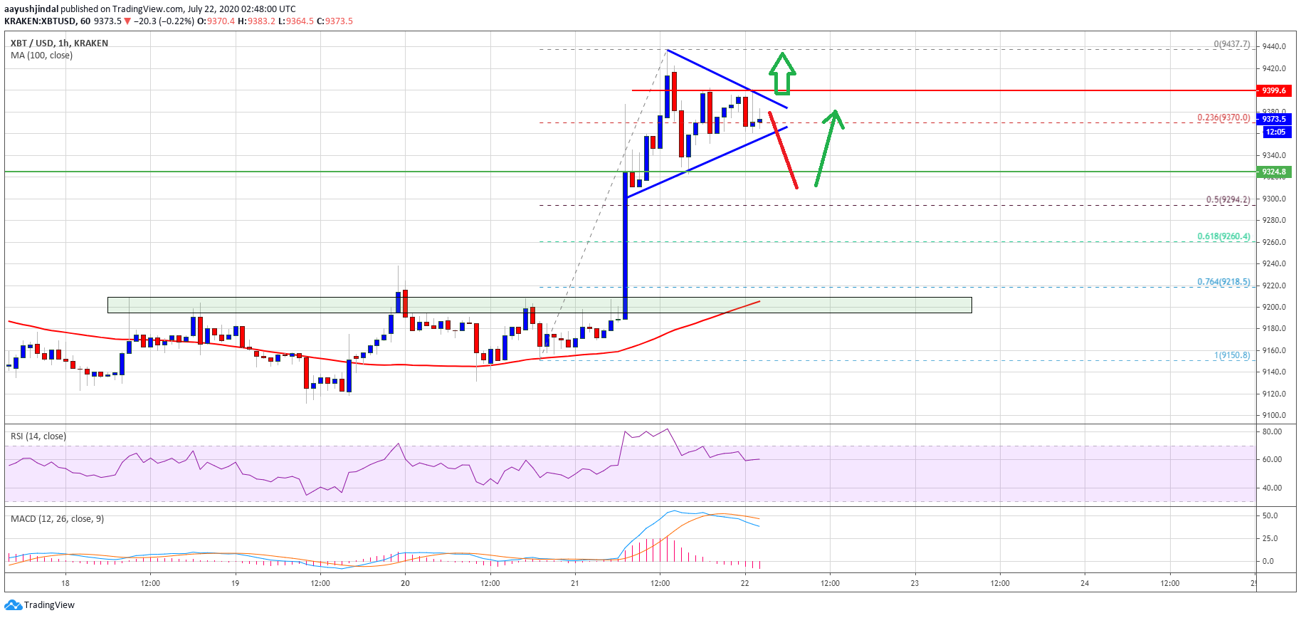 - The pair is likely to continue higher if it clears the $9,385 and $9,400 resistance levels.