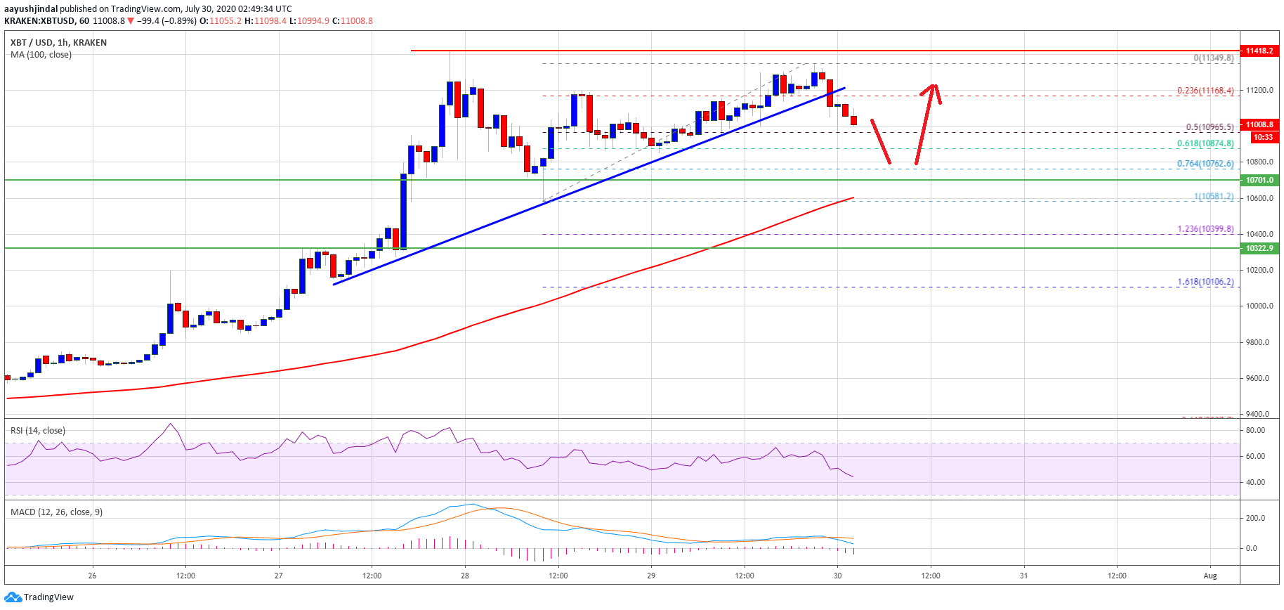 As long as the price is trading above the $10,700 and $10,300 support levels, it is likely to resume its upward move. Any further losses may probably start an extended downside correction and the price could even dive below the $10,000 support.