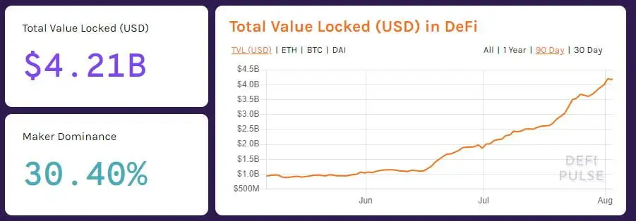 DeFi has seen such growth that per DeFi Pulse, a data service tracking this segment of the cryptocurrency market, there is $4.21 billion worth of value locked in blockchain-based finance applications.