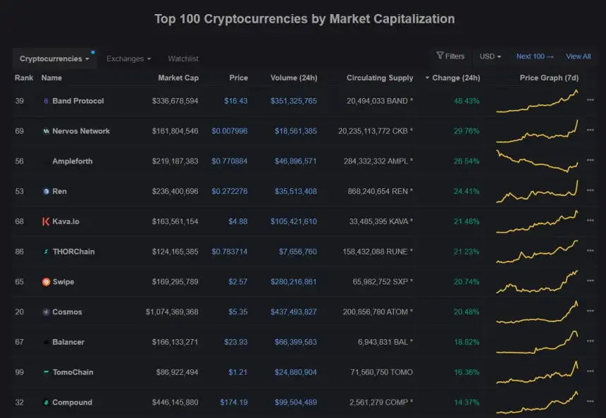 Over the past few days, DeFi-centric tokens have literally gone parabolic. Below is a screenshot from Coin Market Cap of the top-performing cryptocurrencies in the past 24 hours (top-100 digital assets).