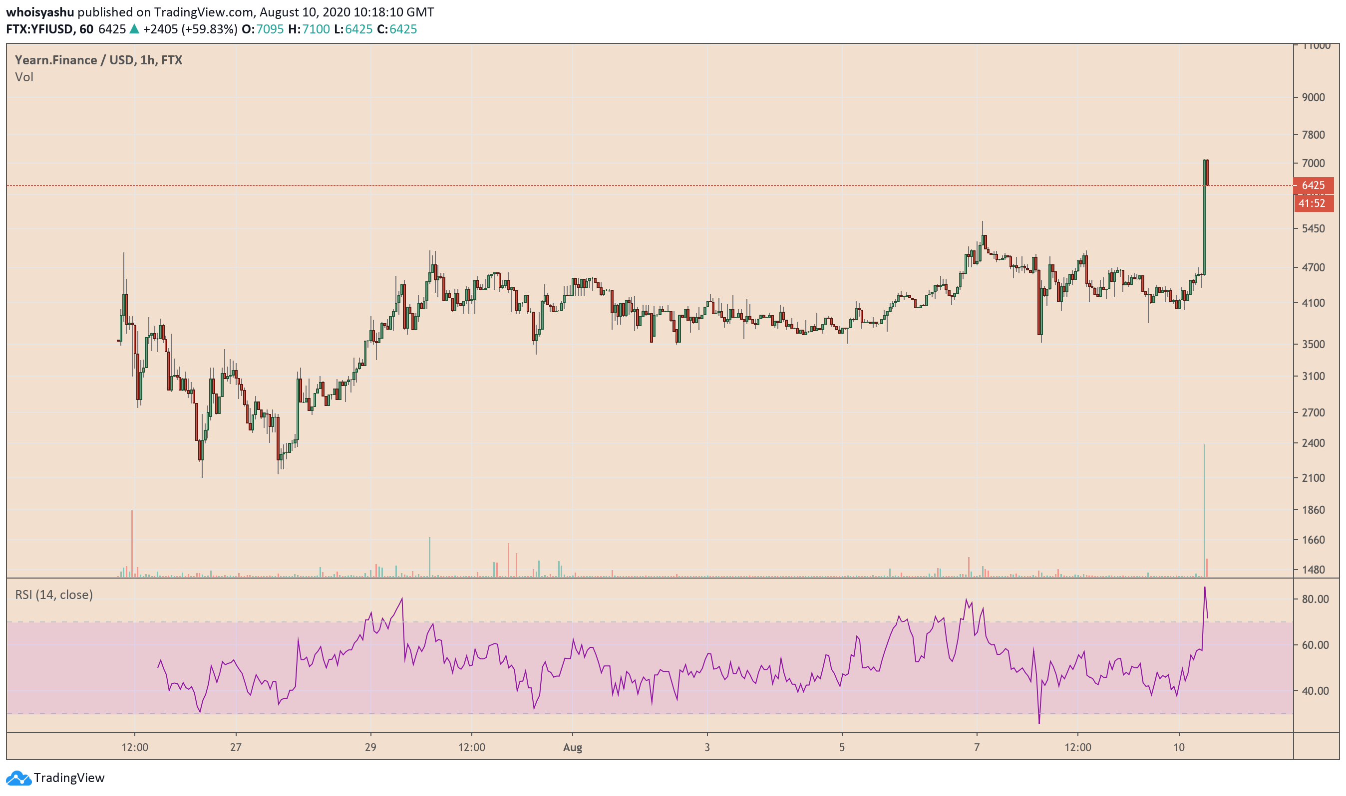 The Malta-based cryptocurrency exchange announced that it would open trading for YFI/BNB, YFI/BTC, YFI/BUSD, and YFI/USDT trading pairs by August 10, 1200-UTC. One hour after the news broke out, the YFI/USD exchange rate surged 55 percent to top at $7,100.
