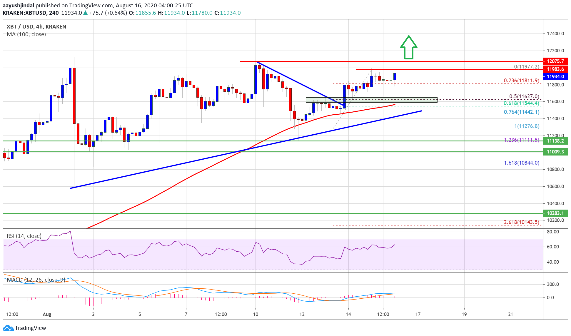 The pair retested the $12,000 resistance zone and it is currently consolidating gains. An initial support is near the $11,800 level. It is close to the 23.6% Fib retracement level of the recent upward move from the $11,276 swing low to $11,977 high.