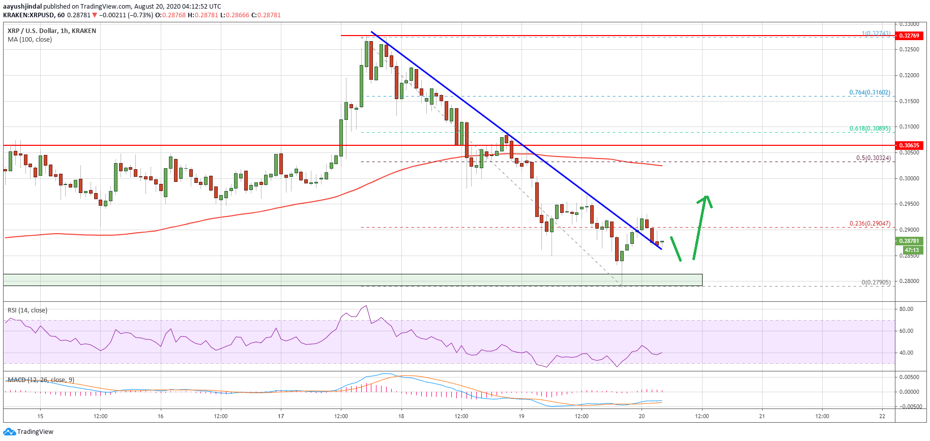 Ripple extended its decline and tested the $0.2800 support against the US Dollar. XRP price is likely to start a slow and steady rise as long as it is above the $0.2800 support.