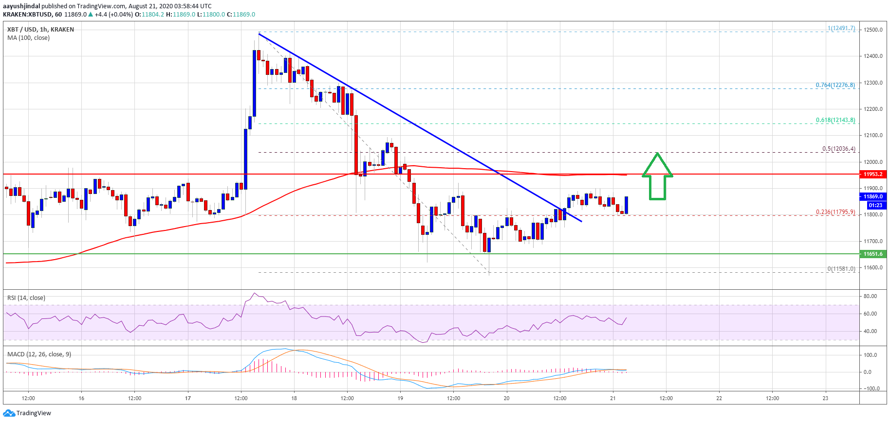 A swing low is formed near $11,581 and the price is currently recovering. It broke the $11,800 resistance zone, plus there was a break above the 23.6% Fib retracement level of the downward move from the $12,491 high to $11,580 swing low.