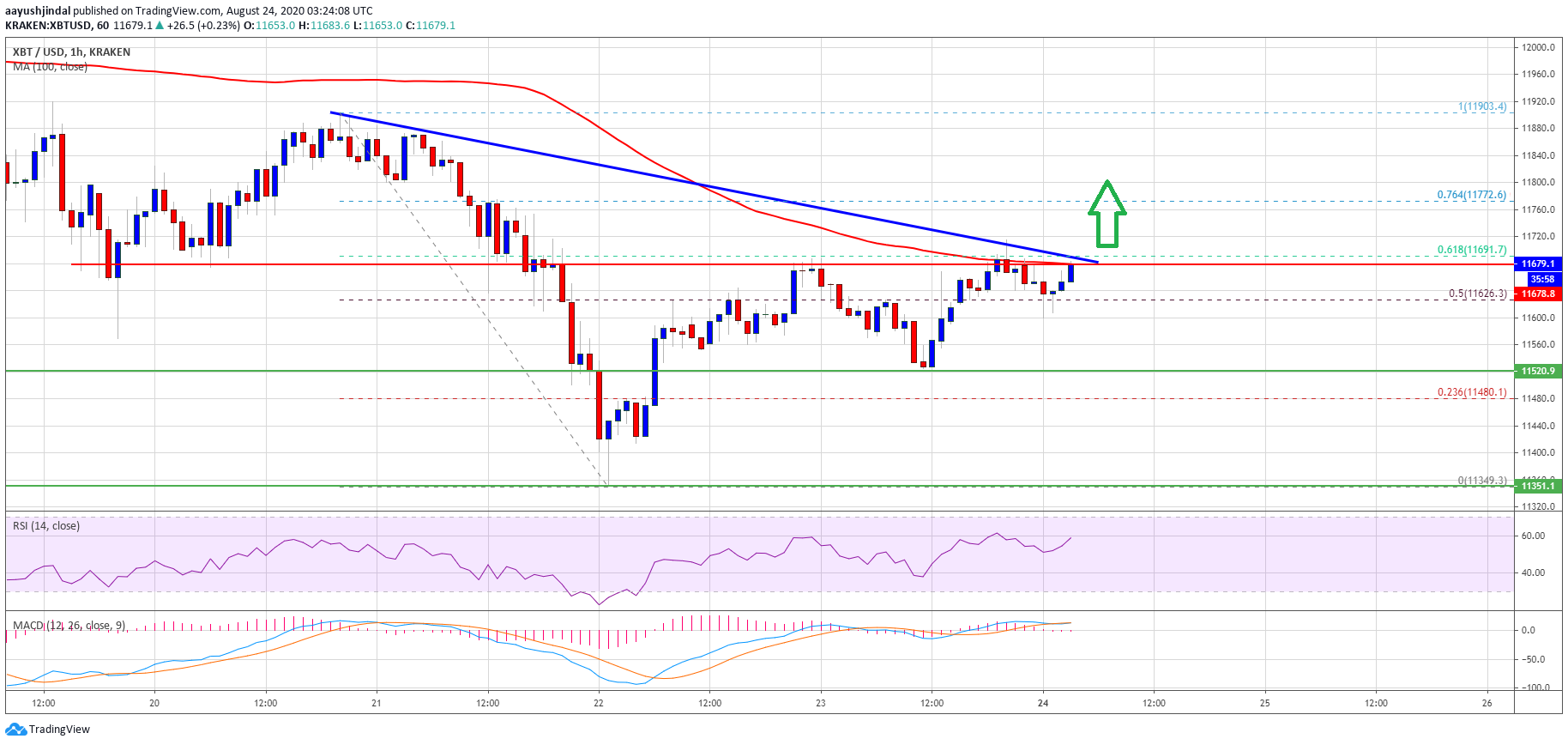 Bitcoin price formed a decent support base above the $11,350 level and recently started a recovery wave against the US Dollar. BTC broke a couple of key hurdles near the $11,500 and $11,600 levels.