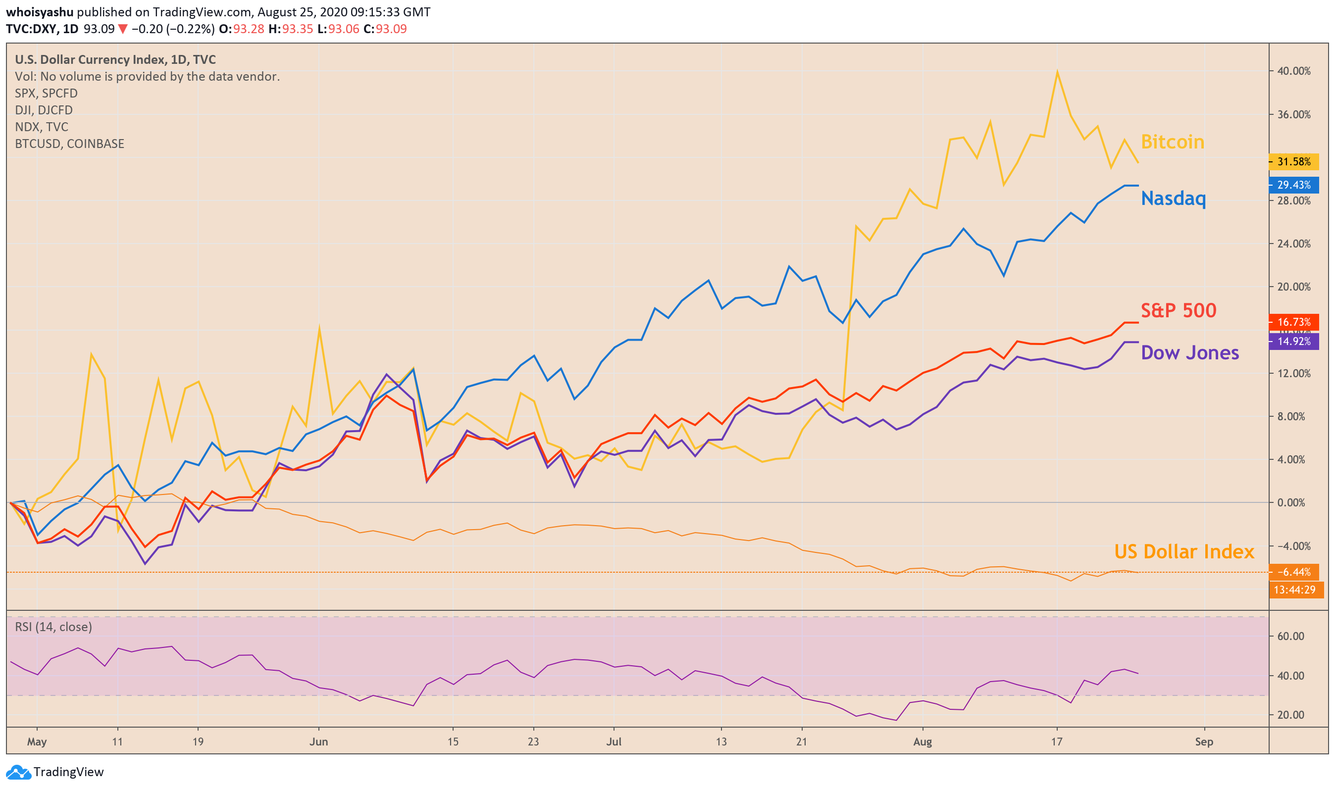 Bitcoin against the US dollar index, Dow Jones, Nasdaq, and the S&P 500. Source: TradingView.com