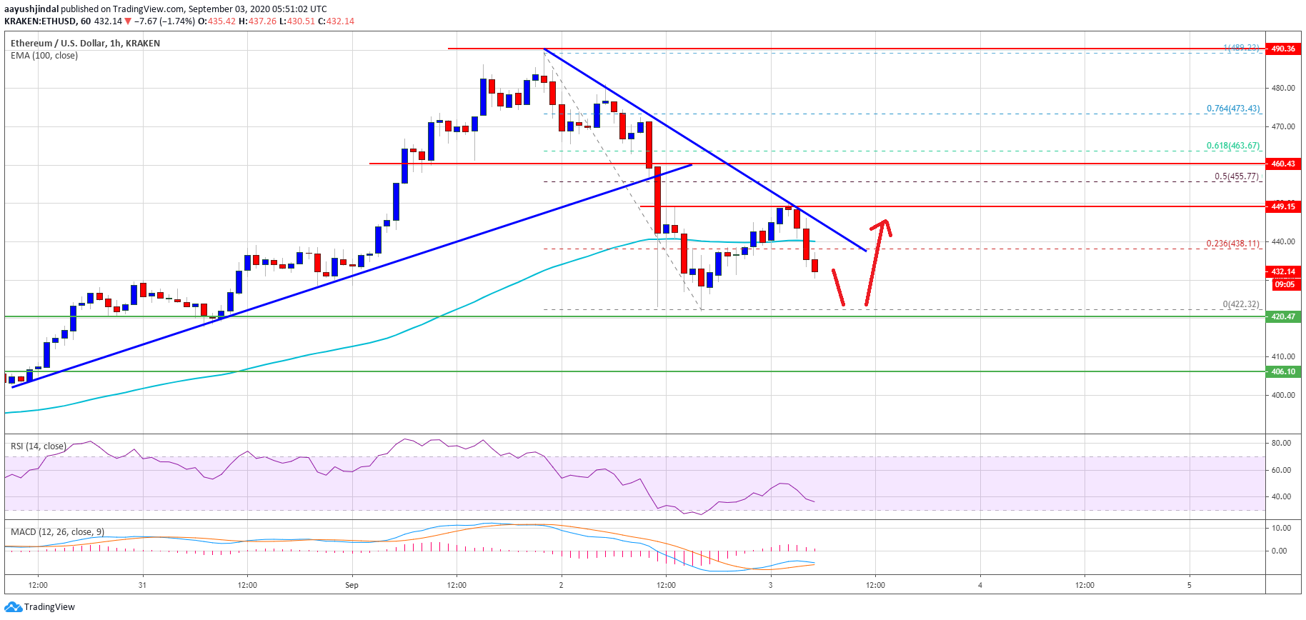 However, the bulls lost control and ether price declined sharply below the $450 support level. The price is down over 10% and it even broke the $435 support. It traded close to the $420 support and settled below the 100 hourly simple moving average.