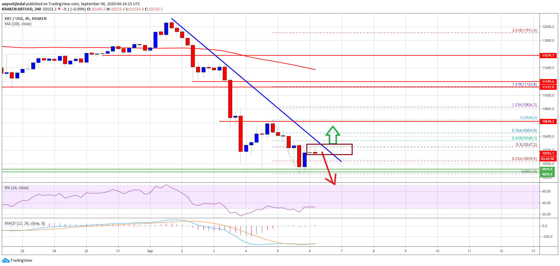 - The price even spiked below $10,000 and settled below the 100 simple moving average (4-hours).