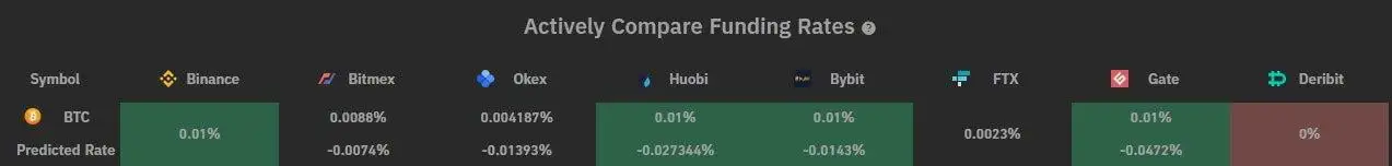Table of the funding rates of the top BTC derivatives exchanges at current and the predicted funding rate from ByBt, shared by crypto trader Byzantine General (@Byzgeneral on Twitter).