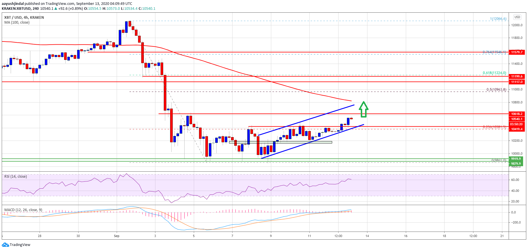 A decent recovery wave is underway and the price already climbed above the $10,200 and $10,400 resistance levels. There was a break above the 23.6% Fib retracement level of the downward move from the $12,066 high to $9,850 swing low.