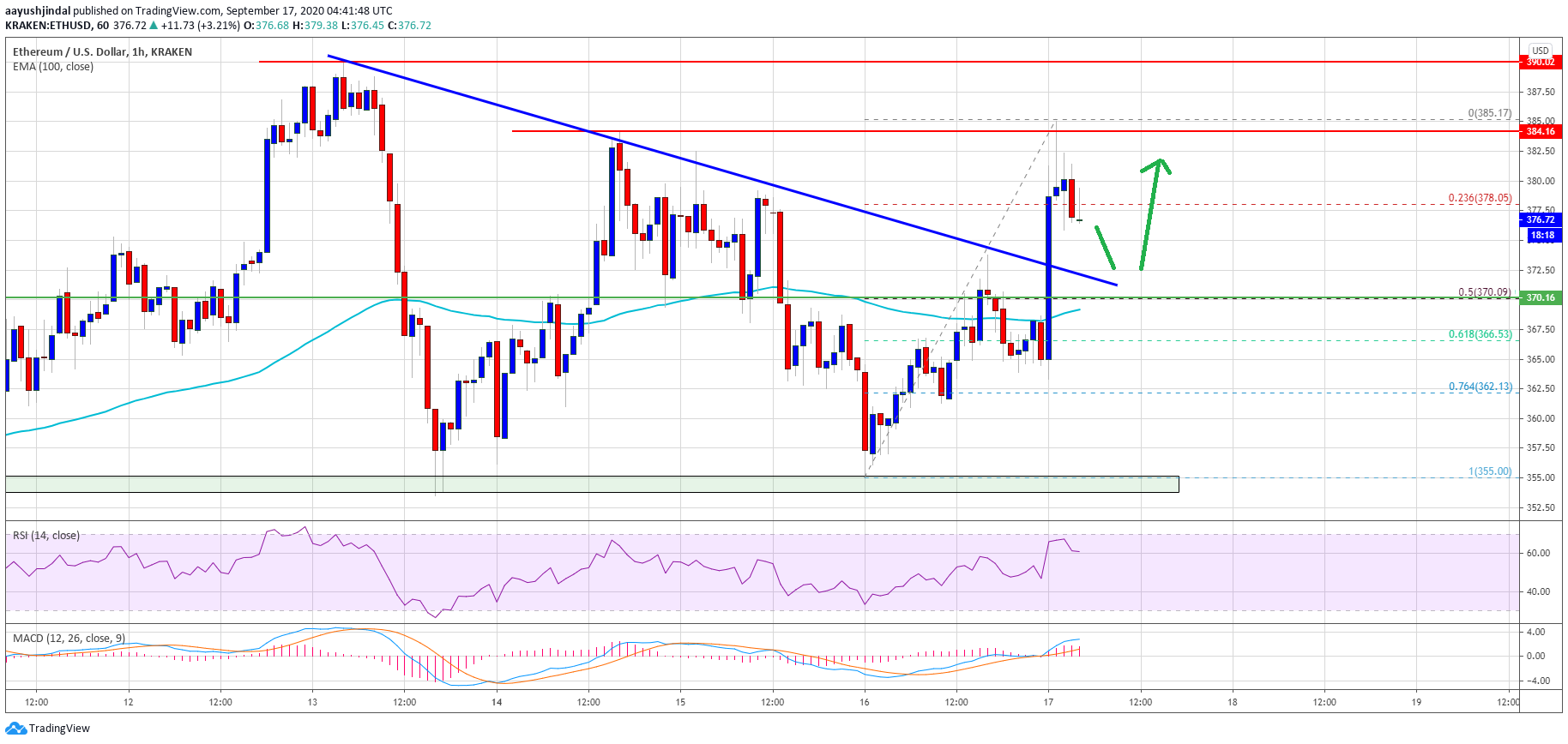 Ether price is up over 5% and it tested the next important resistance near the $385 zone. A high is formed near $385 and the price is currently correcting lower. It broke the $380 level and the 23.6% Fib retracement level of the upward move from the $355 low to $385 high.