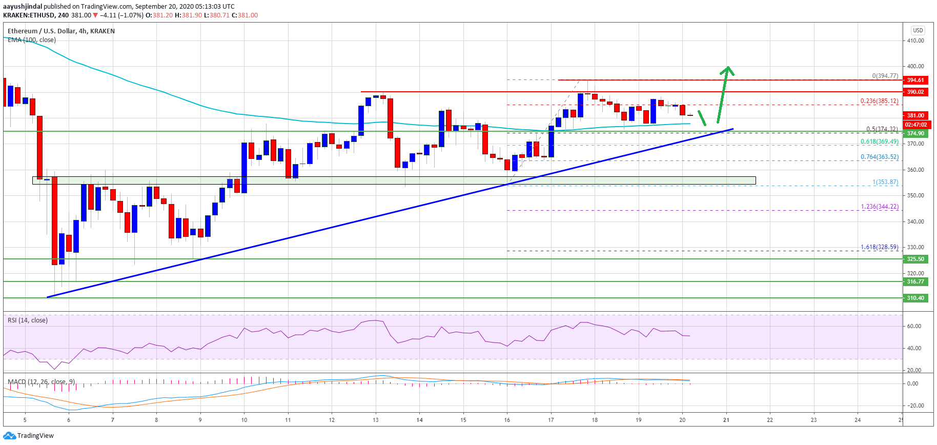 - There is a key bullish trend line forming with support near $374 on the 4-hours chart of ETH/USD (data feed via Kraken).