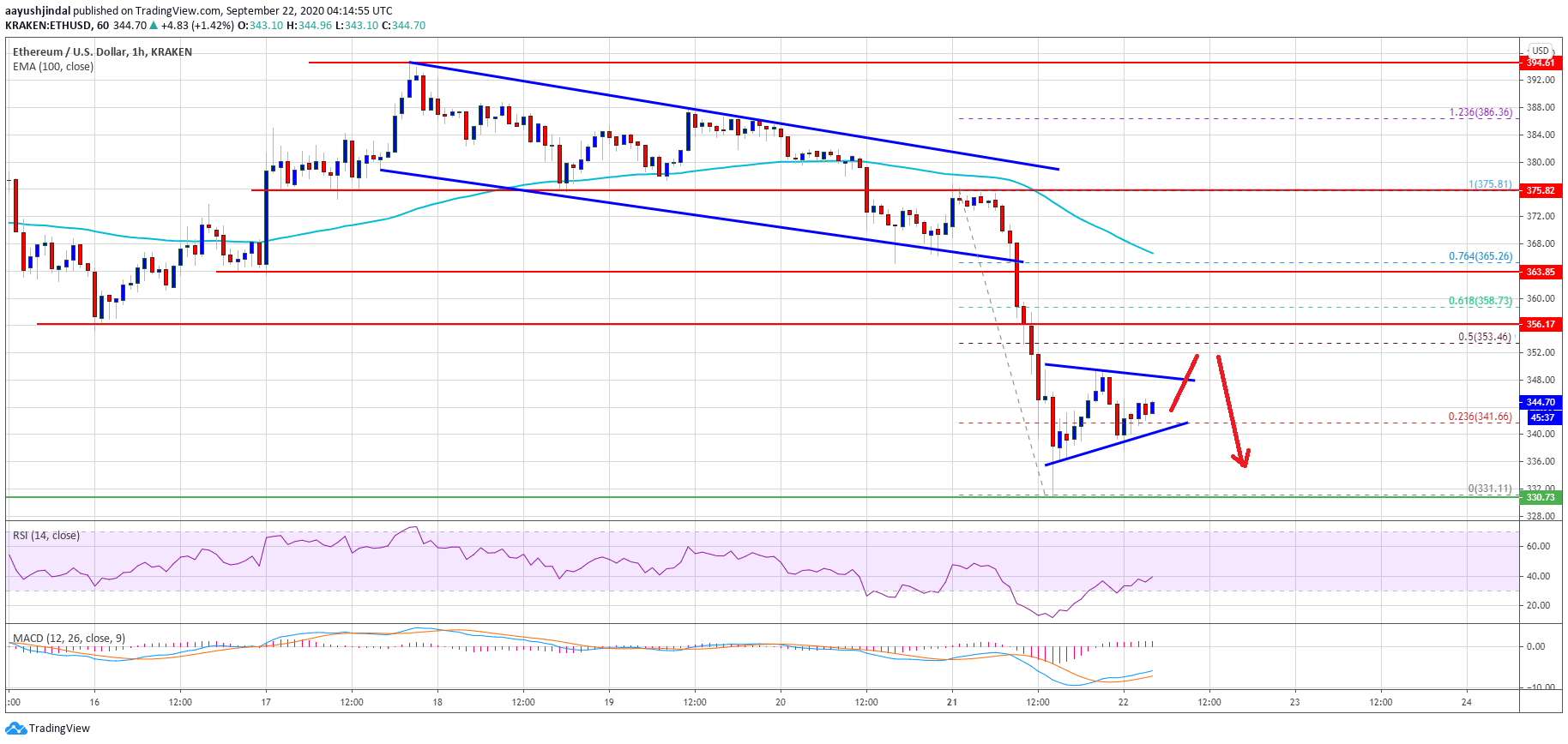 Ethereum is down over 8% and it broke many key supports near $355 against the US Dollar. ETH price is currently consolidating losses and it is likely to face hurdles near $355 or $362.