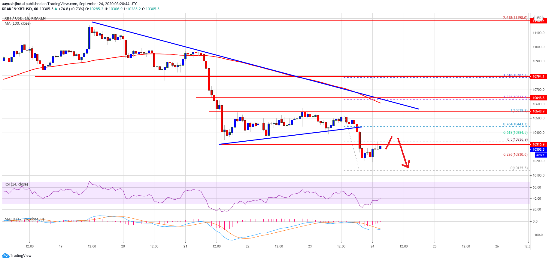 Bitcoin price failed to correct higher and declined further below $10,200 against the US Dollar. BTC remains at a risk of more downsides below the $10,000 support.