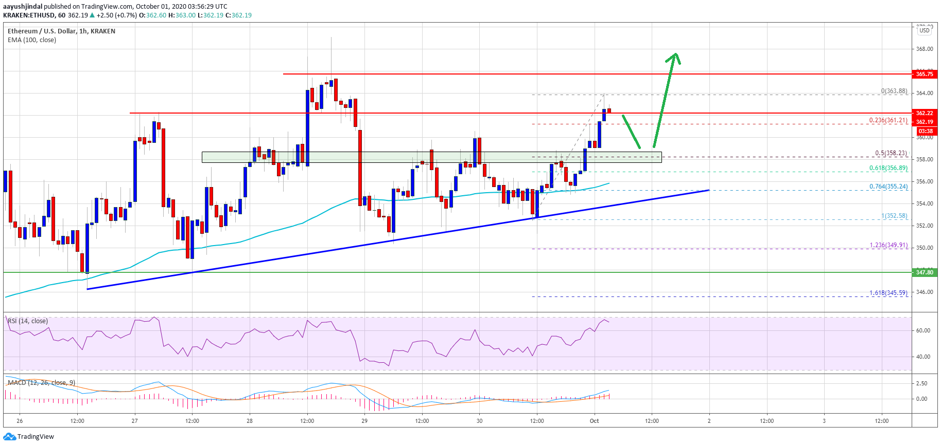 The price climbed above the $358 and $360 levels. Ether is now testing the $362 resistance and it is showing a few positive signs (similar to bitcoin). If there is a downside correction, the price could find support near the $360 level.