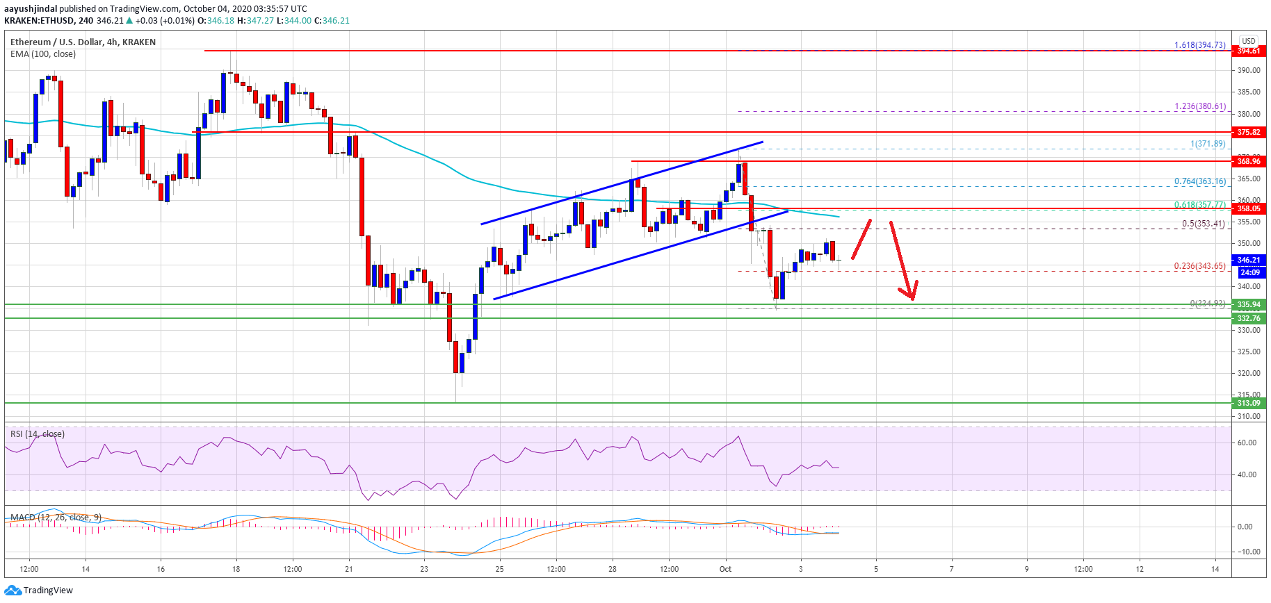 - There was a break below a major ascending channel with support near $355 on the 4-hours chart of ETH/USD (data feed via Kraken).